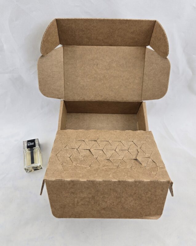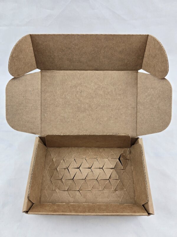 What makes these boxes a great e-commerce packaging solution is that they contain and protect any item being shipped, with a built-in corrugated board mesh panel that firmly holds the item being shipped, without additional components such as glue, tape, bubble, foam, loose fill, or additional corrugated components. The numbered photos below show the process which is: