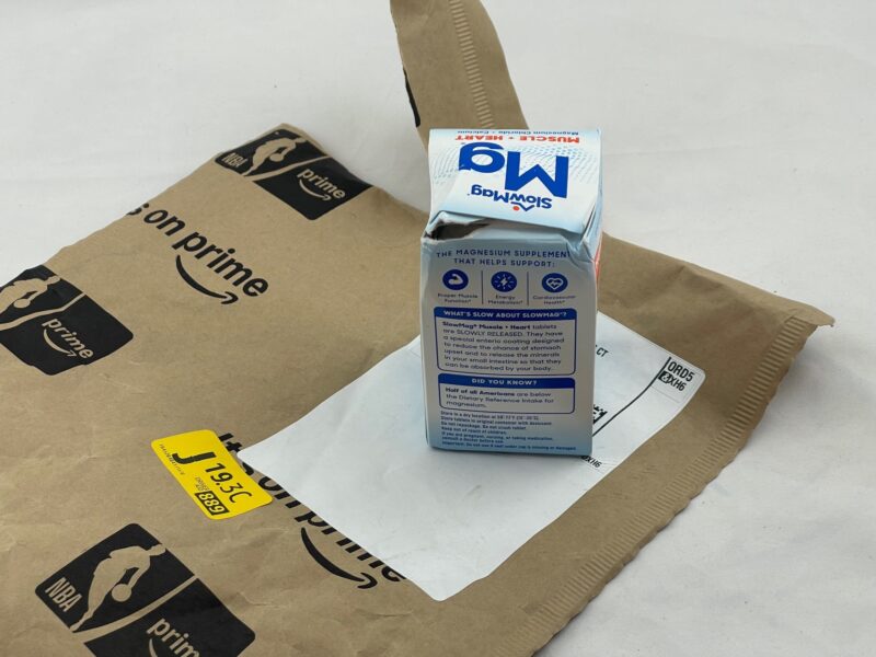 The attached photo shows a fairly basic and simple packaging application: a plastic bottle of magnesium tablets in a paperboard folding carton. The problem begins when that carton is placed within an unpadded, paper mailer envelope. Undoubtedly, it is a lower cost shipping container, in terms of material, labor and possibly even shipping costs. Good for Amazon!